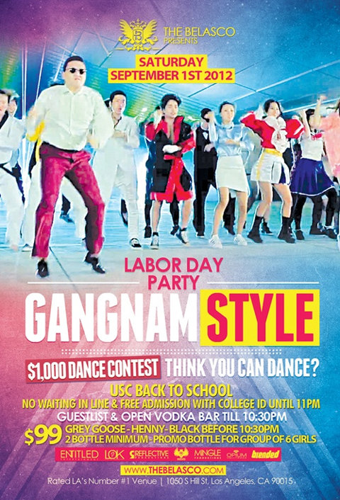 ‘강남스타일’ 댄스대회는 미국 LA에 위치한 벨라스코 극장(The Belasco)에서 주최하는 것으로 알려졌다. 벨라스코 극장은 공식 홈페이지를 통해 오는 9월 1일 ‘강남스타일’ 댄스대회를 개최한다고 공지했다. 더불어 ‘강남스타일’ 뮤직비디오의 한 장면을 배경으로 한 포스터도 함께 게재했다. ‘강남스타일’ 댄스대회의 타이틀은 ‘강남스타일 파티’(Gangnam Style party)로, 우승자에게는 1000 달러의 상금이 주어진다고 한다.