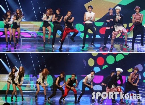 AOA, 제아, B.A.P가 30일 오후 서울 상암동 CJ E&M 센터에서 열린 ‘Mnet 엠카운트다운(엠카)’에 출연해 싸이의 강남스타일을 합동공연 하고 있다.