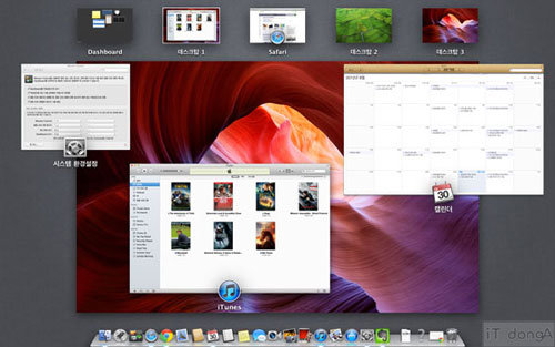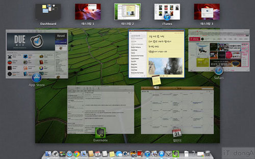 미션컨트롤의 실체를 확인하려면 키보드 왼쪽 상단의 미션컨트롤 키(F3)를 누르거나,손가락 3개를 트랙패드(터치패드)에 대고 위쪽으로 문질러보자. 이렇게 하면 미션컨트롤 기능이 실행되는데, 현재 대시보드 및 각 데스크탑의 상황, 그리고 실행 중인 응용프로그램의 창이 일목요연하게 표시된다.
