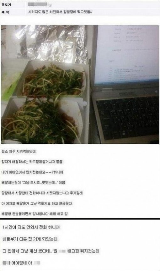 시간이 지나 이 사이트에는 또 다른 네티즌이 ‘와 치킨시켰는데’라는 제목으로 “1시간이 돼도 안와서 전화하니까 배달부가 다른 집에 가게 됐는데 그 집에서 그냥 계산했다네. 배고파 죽겠는데 어이없네”라는 글을 올렸다.
