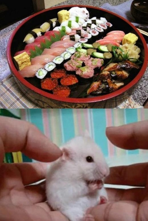 사진 속 햄스터가 마치 초밥을 맛있게 먹는 듯한 자세를 취하고 있어 ‘초밥 훔친 범인’이라는 제목이 붙어있는 것이다.