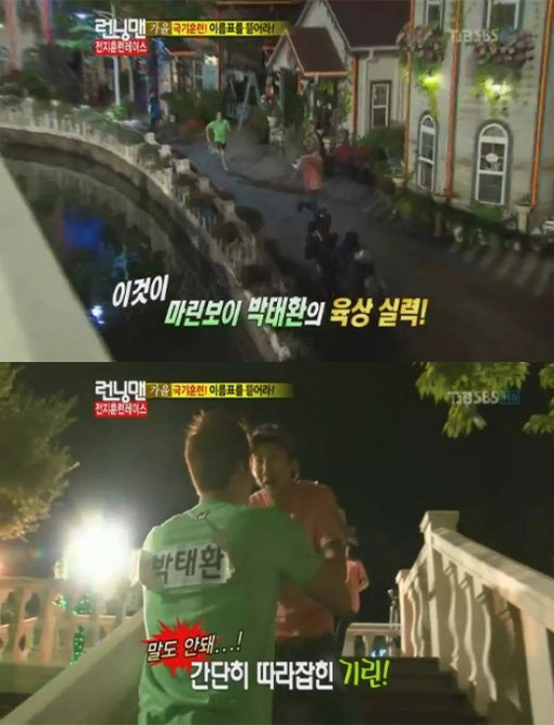 이날 방송에서 박태환은 개리, 김종국과 한 팀을 이뤘다. 박태환은 본격적인 이름표 떼기 미션이 시작되자 이광수를 쫓기 시작했다. 그는 앞서 달린 DJ를 단 번에 따라잡았고, 이광수 역시 간단히 잡았다.