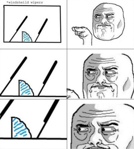 사진 속에는 한 남성이 비 오는 날 자동차 와이퍼를 작동시키고 있다. 그러나 와이퍼 사이 삼각지대가 닦이지 않는 것으로 보고, 불편한 시선을 보내고 있다.