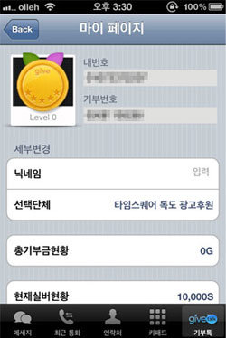 ‘마이 페이지’ 왼쪽 상단을 보면 레벨을 확인할 수 있다. 레벨은 기부를 얼마나 많이 했는지를 나타내는 등급으로, 통화를 많이 할수록 상승한다. 그러나 현재는 앱 상에서 누가 가장 많이 기부를 했는지, 이용자들 중 나의 순위는 어떤지 등을 알 수가 없다. 개발사 측은 “현재 이 기능을 개발 중이며, 레벨과 관련해 다양한 이벤트를 진행할 예정이다”라고 밝혔다.