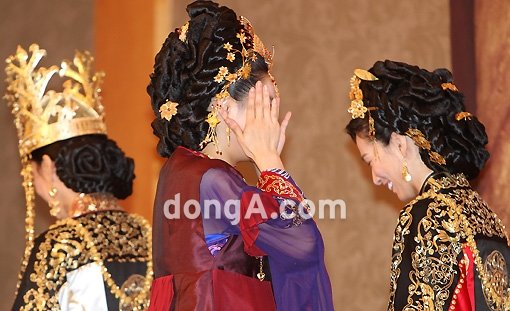 배우 이영아(가운데)가 6일 오후 서울 마포구 가든호텔에서 열린 KBS 드라마 ‘대왕의 꿈’ 제작발표회에서 머리를 매만지고 있다.