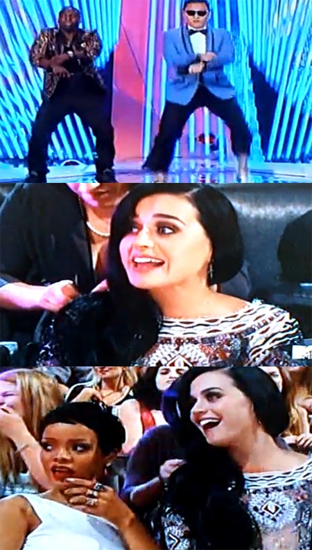 이에 팝스타 케이티 페리와 리한나는 관중석에서 싸이의 무대에 시선을 때지 못했다. 두 사람은 싸이의 거친 몸짓에 매료된 듯 하다. 특히 케이티페리는 이후 VIP 자리에서 싸이에게 볼 뽀뽀를 선사해 싸이에 대한 관심을 표현하기도 했다.