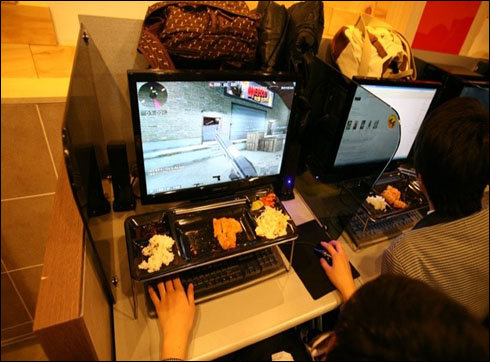 사진을 보면 게이머들이 특수제작된 식판을 자판기 위에 놓고 게임에 열중하고 있는 것을 볼 수 있다.