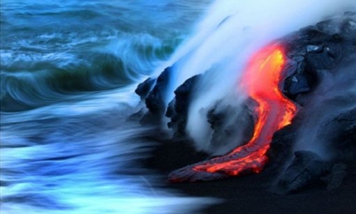 이 사진에는 화산이 폭발해 용암이 바다로 흘러드는 경이로운 장면이 담겨져 있다. 이는 미국의 사진작가 닉 셀웨이(28)와 CJ 칼(35)이 하와이 킬라우에아 화산 주변에서 고된 기다림 끝에 용암과 바다가 만나는 순간을 포착한 것으로 알려졌다.