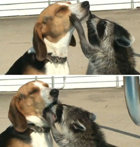 이때 너구리 한 마리가 등장해 앞 발을 이용, 개의 얼굴을 연신 어루만진다. 이 모습이 마치 세수를 시켜주는 모습처럼 보인 것이다.