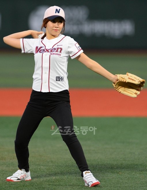 14일 저녁 서울 목동야구장에서 열린 2012프로야구 넥센과 한화의 경기에서 스포츠 채널 최희 아나운서가 시구를 하고 있다.