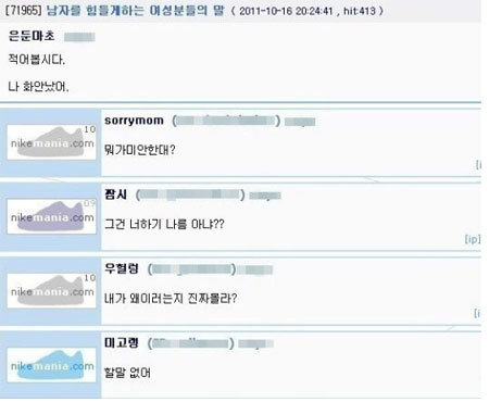 최근 한 온라인 커뮤니티 게시판에는 ‘남자를 힘들게 하는 말’이라는 제목의 게시물이 올라와 누리꾼들의 시선을 모았다.