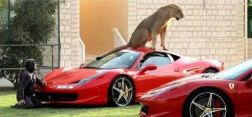 지난 12일 아랍모터스TV 홈페이지에 공개된 해당 사진은 ‘페라리 458 이탈리아 스파이더’ 차량 위에 암사자 한 마리가 앉아 있는 모습을 담고 있다.