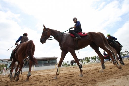 말을 타고 서울경마공원 승마장을 천천히 돌고 있는 기수들. 20일부터 4일간 서울경마공원에서 열리는 2012 말산업박람회에는 국내외 100여개 말산업 관련 기업이 참가해 말산업 동향과 기술을 관람객에게 선보인다. 사진제공|한국마사회