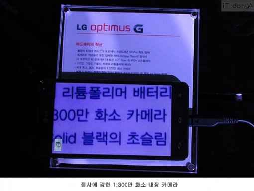 옵티머스G 출시 행사가 열린 서울 그랜드힐튼호텔에는 국내외 언론/매체 취재진과 관계자, 블로거 등이 대거 몰려 LG 스마트폰 신제품에 대한 관심을 짐작하게 했다. 옵티머스G는 4.7인치 IPS 디스플레이 화면(해상도 1,280 x 768)에 퀄컴 스냅드래곤 S4 프로 프로세서(쿼드코어), 2GB 메모리, 구글 안드로이드 4.0(아이스크림샌드위치) 운영체제 등을 내장한 현존 최고 사양의 스마트폰이다(2012년 9월 기준). 뒷면 카메라 화소는 무려 1,300만이다(전면은 130만 화소). 스마트폰 카메라도 이제 기가(giga)급 화소를 제공하게 됐다. 참고로 배터리는 내장형(교체 불가)이다.