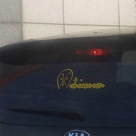 이 초보운전 표시에는 “올~ㅋ 너무 가까운 거 아님?ㅋ”라고 애교섞인 문구가 눈에 띈다. 자신의 초보운전이기 때문에 미연에 안전거리를 유지해달라는 당부로 보인다.