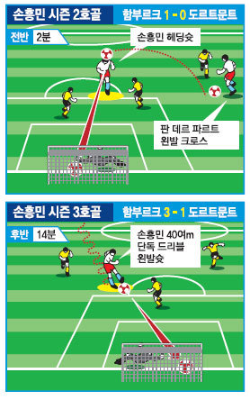 손흥민은 프랑크푸르트 원정에서 골 맛은 봤지만 평가는 엇갈렸다. 대부분 독일 언론들은 ‘보류’ 입장이었다. 하지만 상황은 금세 바뀌었다. 도르트문트전에서 손흥민은 킥오프 2분 만에 판 더 파르트가 문전 왼쪽에서 띄워준 크로스를 헤딩슛으로 연결, 상대 골 망을 갈랐다. 2-1로 앞선 후반 14분에는 하프라인 오른쪽에서 볼을 차지한 뒤 중앙으로 돌파하다 벼락같은 왼발 슛으로 상대 추격 의지를 꺾었다.