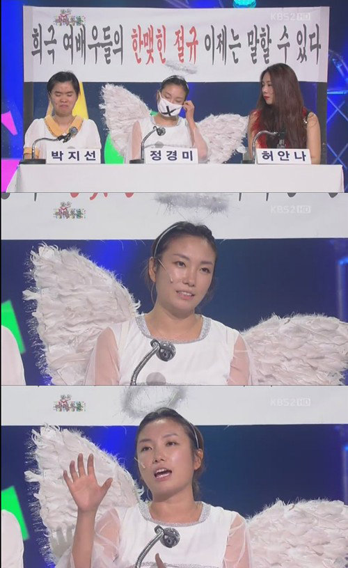 정경미는 23일 방송된 KBS2 ‘개그콘서트’의 ‘희극 여배우들’ 코너에서 “나는 더 이상 요정이 아니다. 그냥 한낱 노처녀다. 나는 오늘 일주일 전 결혼한 이승윤을 고소한다”고 말문을 열었다.