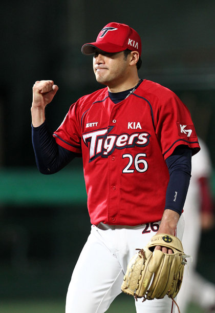 23일 목동 넥센전. KIA가 7-0으로 앞선 9회말 2사 1·2루 위기에서 박헌도의 타구를 3루수 박기남이 잡아 1루로 던지는 순간, 서재응은 오른손을 번쩍 들었다. 2008년 KIA 유니폼을 입고 국내 무대를 밟은 그는 메이저리그 생활 6년을 포함해 프로 데뷔 후 14년 만에 첫 완봉승을 거뒀다. 5회까지는 단 한 명의 진루도 허락하지 않는 퍼펙트 피칭. 6회 1루수 황정립의 실책으로 퍼펙트 행진이 깨졌고, 지재욱에게 2루타를 허용하며 노히트노런도 무산됐지만 첫 완봉승의 기쁨을 만끽했다.
