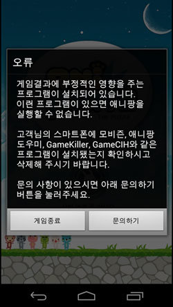이와 함께 오토 및 해킹에 사용된 것으로 추정되는 외부 애플리케이션(이하 앱)들을 무더기로 막았다. ‘애니팡 도우미’, ‘Gamekiller’ 등 대부분 게임에 직접적으로 조작을 가하는 불법 해킹 앱들이다. 문제는 여기에 USB 디버깅으로 안드로이드폰을 관리하는 합법적인 솔루션 앱 ‘모비즌’까지 도매금으로 넘겼다는 것. 모비즌은 지난 5월 베타서비스를 시작한 이후 10만 여명이 사용하고 있는 정상적인 앱임에도 불구하고, 오토 프로그램의 도구 중 하나로 쓰였다는 이유로 불법 앱 취급을 받게 된 셈이다.
