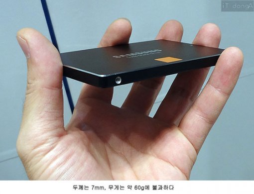삼성전자가 SSD 글로벌 서밋에서 출시한 SSD 840 시리즈는 노트북용 하드 규격인 2.5인치 크기에 무게는 약 60g 정도다. 손으로 들어 보니 역시 기존 노트북 하드보다는 확실히 가볍다. 두께도 얇다. 공식 사양에는 7mm로 되어 있는데, 일반 하드라면 어림 없는 두께다. 결정적으로, 투박한 다른 SSD와 달리 840 시리즈는 검정색 바디에 흰색 ‘SAMSUNG’ 로고를 중앙에 배치에 심플하면서도 눈에 띄는 디자인이 적용됐다. 삼성 SSD의 디자인 아이덴티티인 주황색 네모는 830 시리즈의 좌측 하단에서 중앙 하단으로 이동해 한 눈에 시리즈 구분이 가능하다. PC 내부에 들어가는 부품이지만 디자인도 충분히 고려됐다. 이에 대해 삼성전자 관계자는 “SSD가 고급 부품이라는 인식을 주기 위해 디자인에도 신경 썼다. 그것이 곧 삼성의 브랜드 이미지를 강화하는 방법이라 생각했다”고 설명했다.