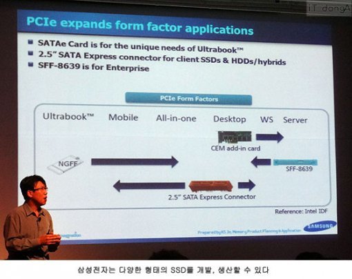 현재 SSD는 PC에 장착할 때 SATA3 규격을 이용하고 있는데, SATA 규격의 데이터 전송 한계가 초당 600MB임에 따라 향후 삼성 SSD는 초당 1GB를 전송할 수 있는 PCIe 규격을 채택할 계획이다. 그럴 경우 SATA 규격보다 데이터 전송 속도도 빠를뿐더러 확장성 측면에서도 이점을 얻을 수 있다. 또한 다양한 형태(폼팩터, form factor)의 SSD를 제작, 장착할 수 있어 여러 산업 분야에 적용 가능하다.