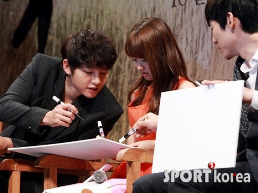 배우 박보영(가운데)이 26일 오후 서울 압구정CGV에서 열린 영화 ‘늑대소년’(감독 조성희) 제작발표회에 참석해 송중기, 유연석(오른쪽)의 관심을 받고 있다.