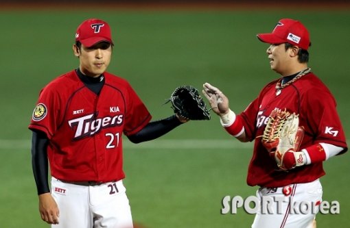 경기종료 후 KIA 선발 윤석민이 나지완과 승리의기쁨을 나누고 있다.