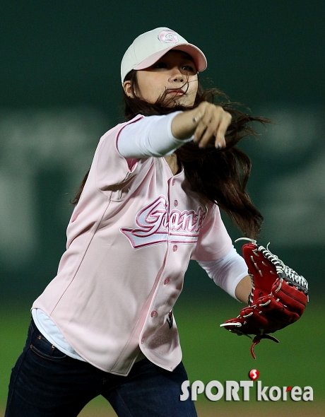 `2012 팔도 프로야구` 롯데 자이언츠와 삼성 라이온즈의 경기가 27일 오후 부산 사직야구장에서 열렸다. 경기전 에이핑크 정은지가 멋진 시구를 하고 있다.