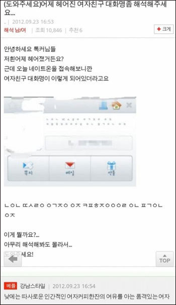 이 남성은 “저희는 어제 헤어졌다. 근데 오늘 메신저를 접속해보니깐 여자친구 대화명이 이렇게 돼있다. 아무리 해석해 봐도 모르겠다. 해석해 달라”고 부탁했다.