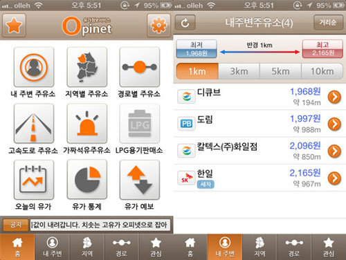 오피넷은 현재 위치에서 가장 가깝고 유가가 저렴한 주유소 정보를 제공한다. 리스트에 있는 주유소를 선택하면 지도 상에서 위치를 파악할 수 있다. 주유소 전화번호, 판매하는 기름의 종류도 확인 가능하다. 이 앱은 지식경제부와 한국석유공사가 만든 앱으로, 적발한 불법 거래 업소가 어디인지도 알 수 있다. ‘가짜석유주유소’ 메뉴를 누르면 품질 기준을 위반하거나 유사 휘발유를 판매하는 주유소가 나온다. 오피넷은 아이폰, 안드로이드폰 전용이다.