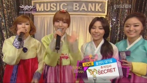 시크릿은 28일 방송된 KBS 2TV ‘뮤직뱅크’에서 무대에 앞서 한복 입고 등장해 “해피추석”이라고 외쳤다.