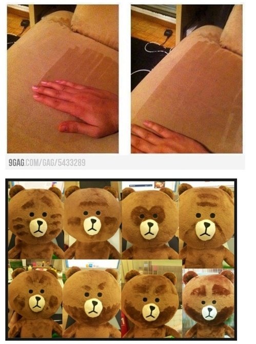 이번엔 같은 소재로 만든 곰돌이 인형에 손을 문지른 사진을 여러 장 선보인다. 인형의 눈, 이마, 수염 등이 변색돼 있는 모습을 볼 수 있다.