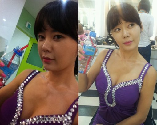 사진 속 안선영은 넥라인이 시원하게 파인 보라색 의상을 입고 요염한 표정을 짓고 있다. 가슴선을 따라붙어 있는 은색 장식이 안선영의 몸매를 더욱 돋보이게 한다.