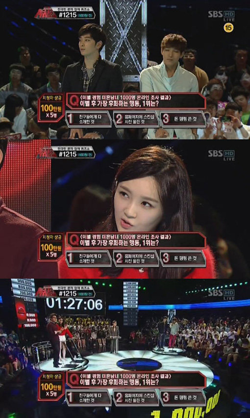 5일 방송된 SBS ‘1억 퀴즈쇼’에서 ‘이별 경험 미혼남녀 1000명 온라인 조사 결과, 이별 후 가장 후회하는 행동 1위는?’이라는 문제가 출제됐다.