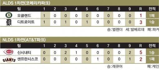 디트로이트가 7일(한국시간) 홈구장 코메리카파크에서 열린 오클랜드와의 아메리칸리그 디비전시리즈(ALDS) 1차전에서 에이스 저스틴 벌랜더의 호투를 앞세워 3-1로 승리했다. 신시내티는 적지인 AT&T파크에서 펼쳐진 내셔널리그 디비전시리즈(NLDS·이상 5전3선승제) 1차전에서 홈런포 2방을 발판으로 샌프란시스코를 5-2로 격파했다.
