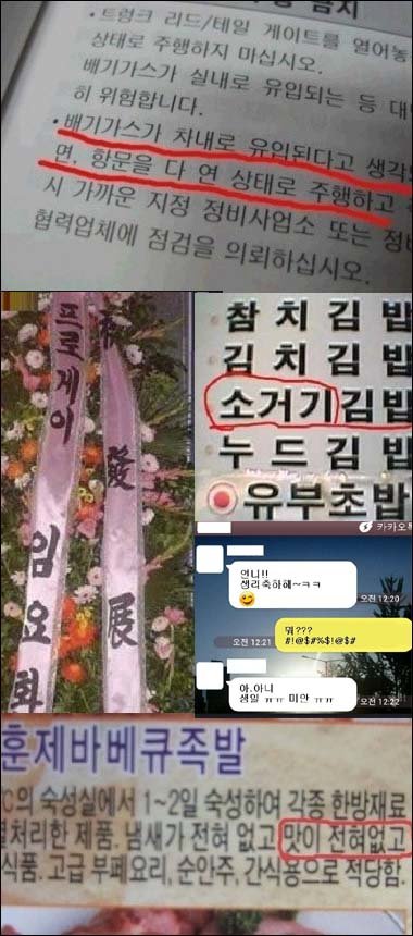 내용을 살펴보면 ‘배기가스가 차내로 유입된다고 생각하면 창문을 다 연 상태로 주행하고’라는 문장에서 ‘창문’이 ‘항문’으로 잘못 적혔고, 프로게이머 임요환이 보낸 화환은 ‘머’자가 빠져 ‘프로게이 임요환’이라고 적혀 있다.