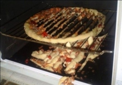 게시판에 공개된 사진에는 오븐 안에 넣어둔 피자가 받침대 사이로 녹아 내용물이 바닥에 떨어져 있는 모습이 담겨 있다.