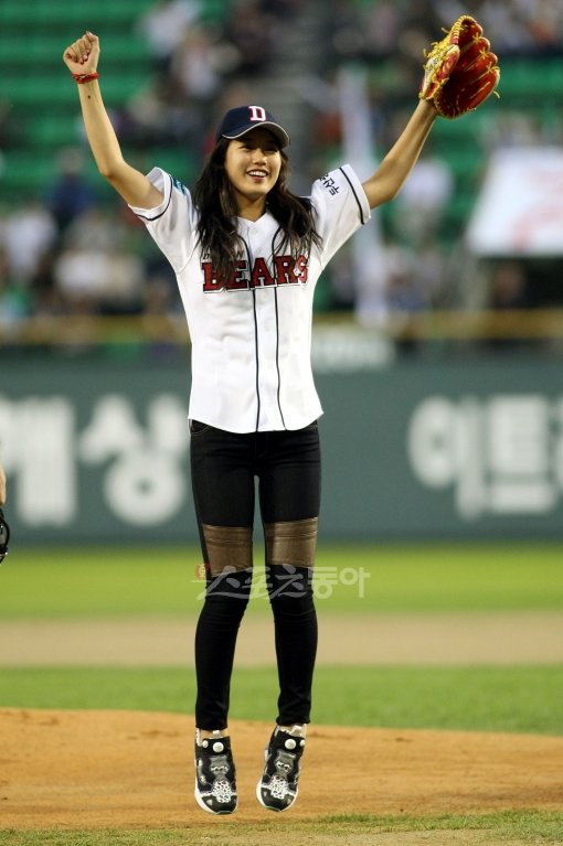 8일 저녁 서울 잠실야구장에서 열린 2012프로야구 두산과 롯데의 준플레이오프 1차전에서 국민여동생 수지가 시구를 한 후 환호하고 있다.