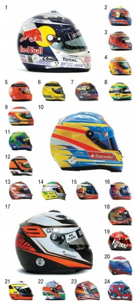 F1은 12개 팀에서 팀당 2명씩 모두 24명의 드라이버가 출전한다. 팀은 머신의 디자인이 확연히 다르기 때문에 쉽게 알아 볼 수 있다. 하지만 300km로 질주하고 있는 같은 팀의 두 선수는 어떻게 구별해야 하는 것일까? 바로 헬멧 디자인이다. 24명의 선수는 모두 각자 고유한 컬러와 디자인의 헬멧을 쓴다. 선수 헬멧 디자인을 알아두면 레이스 중반 선수들이 모두 뒤섞여도 쉽게 응원하는 선수를 찾아낼 수 있다. 이 방법은 서킷에서나 TV 중계를 볼 때나 가장 효율적인 선수 구별법이다.