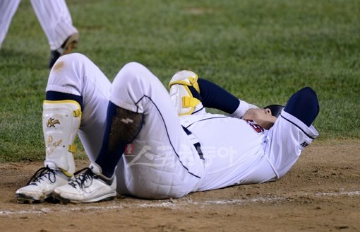 8일 서울 잠실야구장에서 열린 2012 프로야구 준플레이오프 1차전 두산베어스 대 롯데자이언츠 경기 9회말 5-5 동점 상황 1사 1,2루 두산 김현수가 1루수 직선타로 아웃된 후 아쉬운 듯 그라운드에 누워 있다. 잠실|김종원기자 won@donga.com 트위터 @beanjjun