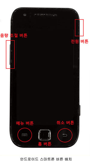 이하의 안드로이드 스마트폰 버튼 이용 방법은 국내에서 많이 판매된 '갤럭시(안드로이드 2.3.6 버전 운영체제 탑재)' 시리즈를 기준으로 작성했다. 안드로이드 스마트폰의 버튼은 '전원', '음량 조절', '메뉴(Menu)', '홈(Home)', '취소', '검색'으로 구성된다. 이 가운데 검색 버튼이 없는 경우도 많다. 이외에 카메라 버튼 등이 추가돼 있는 경우도 있다.