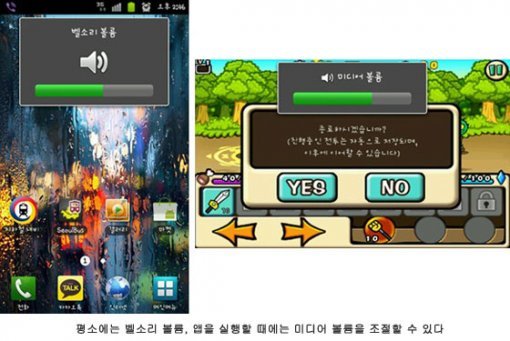 안드로이드 스마트폰의 음량 조절은 '벨소리 볼륨'을 조절하는 것과 '미디어 볼륨'을 조절하는 것 2가지로 나뉜다. 벨소리 볼륨이란 전화가 걸려오거나 메시지(문자)가 도착했을 때 울리는 소리이며, 미디어 볼륨이란 음악이나 동영상을 감상할 때 흘러나오는 소리다. 벨소리 볼륨은 홈 화면 및 메인 메뉴 화면 그리고 전화 화면 등에서 음량 조절 버튼을 누르면 조절할 수 있다. 미디어 볼륨은 각종 음악 및 동영상 재생 앱 또는 웹 브라우저 등지에서 음량 조절 버튼을 누르면 조절할 수 있다.