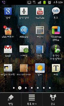 메인 메뉴 화면에서 메뉴 버튼을 누르면 '편집', '목록 보기', '공유'가 나타난다. 편집을 누르면 앱의 위치를 변경하거나 앱을 삭제할 수 있다. 목록 보기를 누르면 앱의 정렬 방향을 변경할 수 있다(기본적으로 가로 방향). 공유를 누르면 설치돼 있는 앱을 메시지나 트위터, 페이스북 같은 SNS(소셜네트워크서비스)를 통해 타인과 공유할 수 있다.