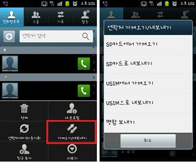 전화번호부에서 메뉴 버튼을 누르면 삭제, 내 프로필, 연락처 데이터 동기화, 가져오기/내보내기, 친구 추가, 계정, 단축 번호, 이메일 보내기, 메시지 보내기, 화면 설정, 설정 등이 나타난다. 이 가운데 중요한 것이 연락처 가져오기/내보내기다. 이를 통해 스마트폰에 저장돼 있는 연락처를 별도 장착된 SD카드나 USIM으로 백업하거나, 그 반대로 SD카드나 USIM에 저장된 연락처를 스마트폰으로 불러올 수 있다. 만약의 경우를 대비해 수시로 연락처를 백업해 PC로 옮겨두는 것을 추천한다.