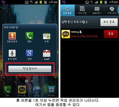 이렇게 스마트폰이 느려지는 것을 방지하기 위해 홈 버튼에는 한가지 기능이 더 있다. 홈 버튼을 1초 이상 누르면 최근에 실행한 앱의 목록이 스마트폰 화면에 나타난다. 목록의 하단을 살펴보면 '작업 관리자', 혹은 '앱 관리자'라는 이름의 메뉴가 있다. 여기에 진입하면 대기중인 앱을 종료할 수 있다. 다만 이 기능은 국내 제조사(삼성, LG, 팬택 등)에서 출시한 스마트폰에만 탑재됐으며, 해외 제조사에서 출시한 스마트폰에는 이 기능이 없을 수도 있다.