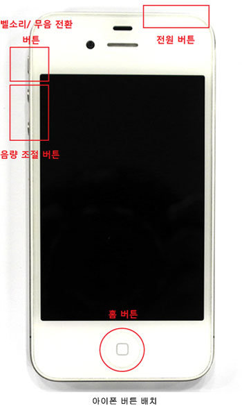 아이폰의 버튼은 '전원', '음량 조절', '홈', '벨소리/무음 전환'으로 구성돼 있다. 아이폰 버튼 이용 방법은 iOS 5.1 버전 운영체제를 탑재한 아이폰 4S 기준으로 작성했다.