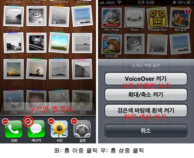 홈 버튼을 3번 연달아 누르면 보이스 오버 토글하기(시각 장애인 보조기능), 검은색 바탕에 흰색 토글하기(화면 색상 반전), 확대/축소 토글하기(확대/축소), 어시스티브 터치 토글하기(시각 장애인 보조 및 화면 강제 고정) 등을 할 수 있다. 다만 홈 버튼을 3번 연달아 누르는 기능은 기본 기능이 아닌 점을 주의 바란다. 이 기능을 이용하고 싶다면 설정 > 일반 > 손쉬운 사용으로 이동해서 홈 삼중 클릭을 활성화해야 한다.