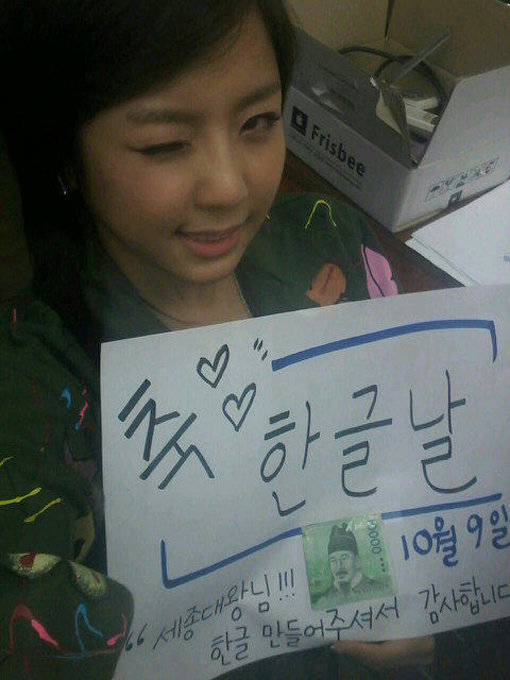 예원은 9일 오전 자신의 트위터에 “10월9일 오늘은 한글날입니다!!! 여러분들도 세종대왕님께 감사드리며 하루를 시작해요!! ♥ 바르고 고운말 쓸께요”라는 글과 사진을 올렸다.