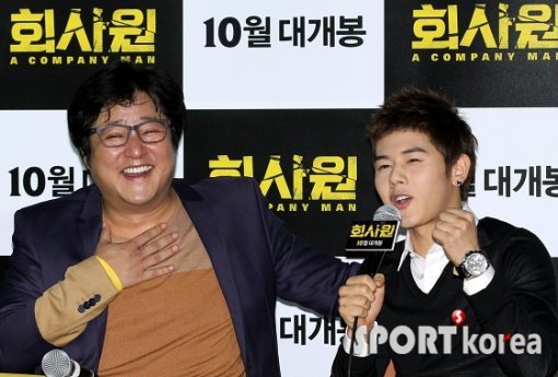 배우 곽도원이 9일 오후 서울 중구 을지로 메가박스 동대문에서 열린 영화 ‘회사원’ 언론 시사회에 참석해 제국의 아이들 김동준(오른쪽)의 말에 폭소를 하고 있다.