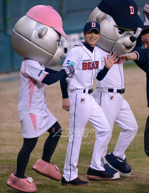 9일 서울 잠실야구장에서 열린 2012 프로야구 준플레이오프 2차전 두산베어스 대 롯데자이언츠 경기 전 오는 30일 경기도 의정부 306 보충대로 입소해 5주의 기초군사훈련을 받고 21개월간 현역 군 복무를 시작할 예정인 남성그룹 슈퍼주니어의 이특이 시구를 위해 마운드에 오르고 있다.